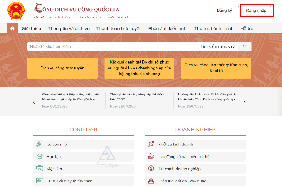 ➧ Bước 1: Truy cập Cổng dịch vụ công quốc gia >> Chọn “Đăng nhập”;