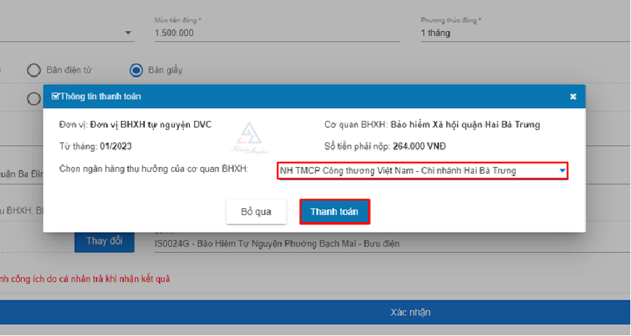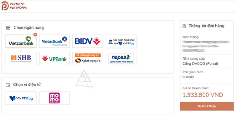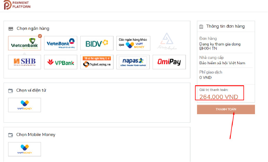 Tiếp tục chọn ngân hàng thụ hưởng, chọn nền tảng thanh toán >> Chọn “Thanh toán” để hoàn tất thủ tục.