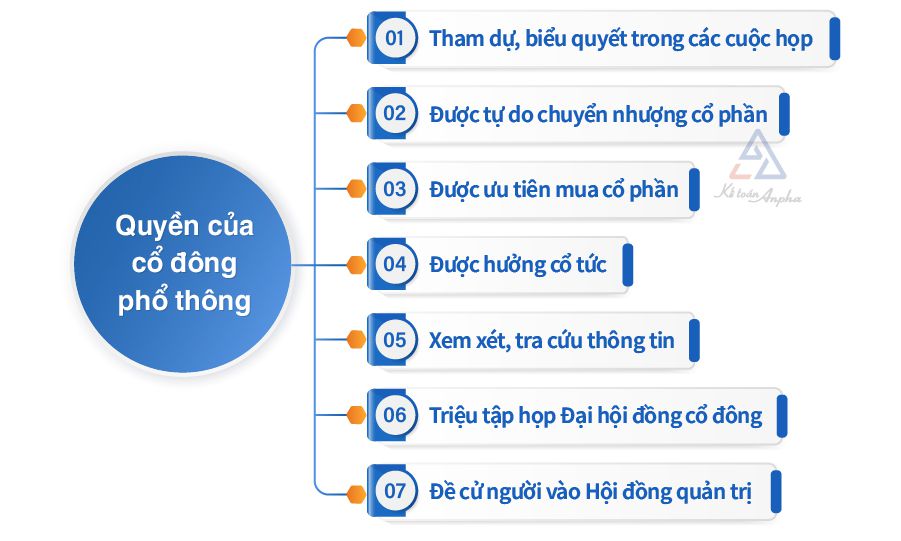 Cổ đông phổ thông có quyền tham dự, biểu quyết trong cuộc họp Đại hội đồng cổ đông, quyền tự do chuyển nhượng cổ phần và quyền hưởng cổ tức.