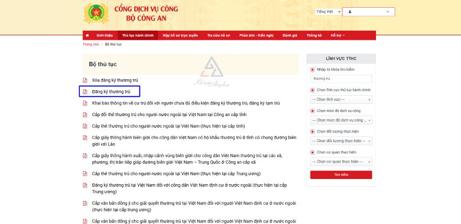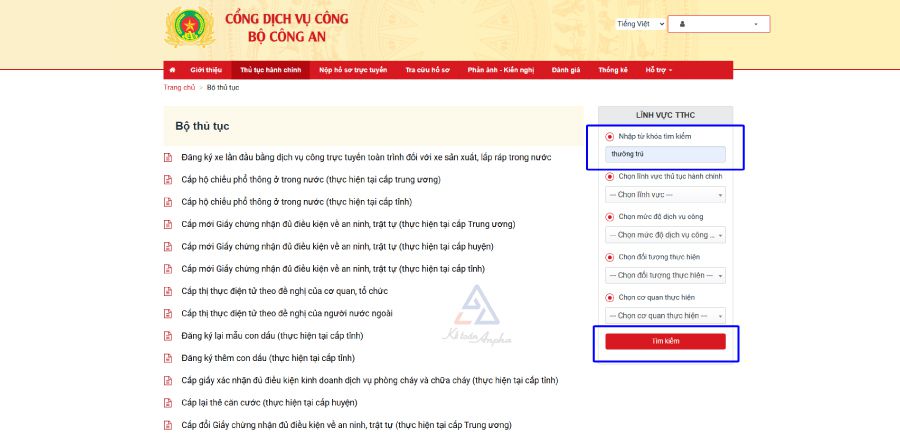 ➧ Bước 2: Truy cập mục “Thủ tục hành chính” ➞ Nhập từ khóa “thường trú” và bấm “Tìm kiếm”;