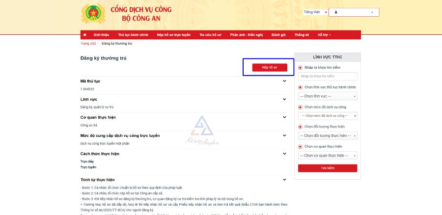 ➧ Bước 3: Chọn thủ tục “Đăng ký thường trú” ➞ Nhấn “Nộp hồ sơ”;
