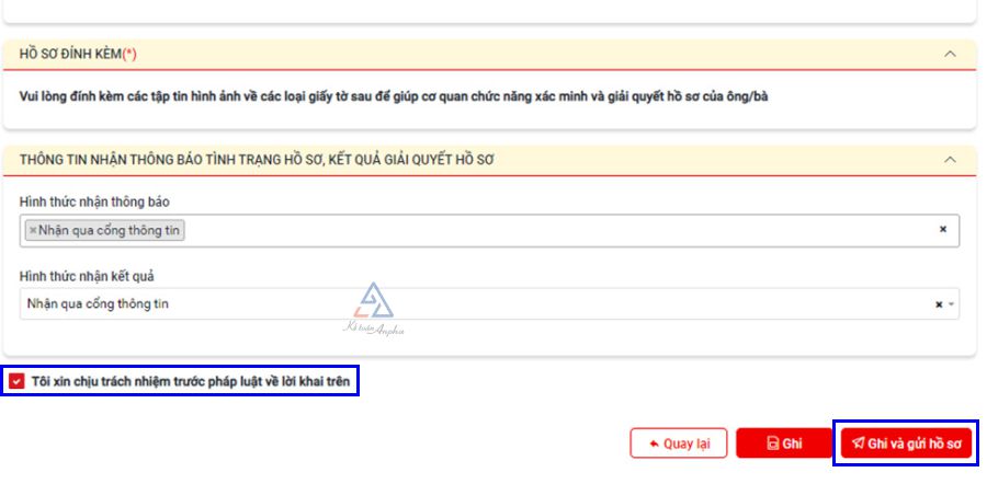 ➧ Bước 5: Nhấn chọn “Tôi xin chịu trách nhiệm trước pháp luật về lời khai trên” và hoàn tất nộp hồ sơ bằng cách nhấn “Ghi và gửi hồ sơ”;