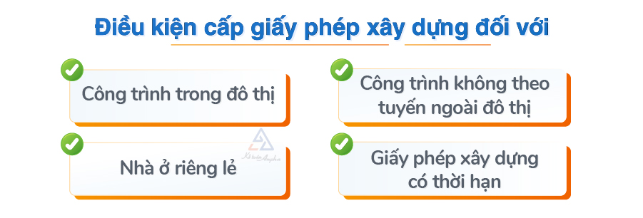 Điều kiện cấp giấy phép xây dựng đối với: công trình trong đô thị, công trình không theo tuyến ngoài đô thị, xây nhà ở riêng lẻ và giấy phép xây dựng có thời hạn.