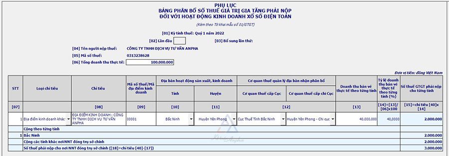 Số thuế GTGT phải nộp tại từng địa điểm |