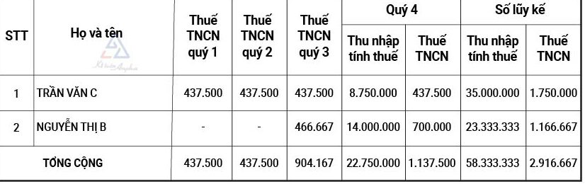 • Thuế TNCN phải nộp = 35.000.000 đồng x 5% = 1.750.000 đồng.