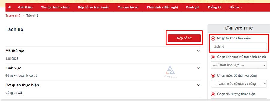➧ Bước 2: Tìm kiếm từ khóa “Tách hộ” ➞ Bấm chọn “Nộp hồ sơ”.