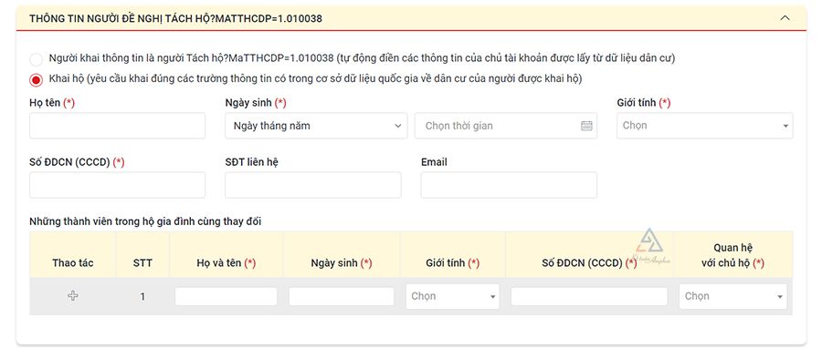 • Trường hợp các thành viên trong gia đình cùng tách hộ để đăng ký hộ mới thì chọn “Khai hộ” và điền đầy đủ thông tin của những người cùng tách hộ.