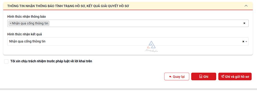➧ Bước 5: Chọn hình thức nhận kết quả ➞ Tích chọn ô “Tôi xin chịu trách nhiệm trước pháp luật về lời khai trên” và bấm “Ghi và gửi hồ sơ” để hoàn tất thủ tục tách hộ.