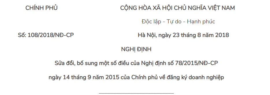 Chính phủ ban hành Nghị định sửa đổi, bồ sung một số điều của Nghị định sô 78/2015/M9)-CP ngày 14 tháng 9 năm 2015 của Chính phủ v đăng ký doanh nghiệp.